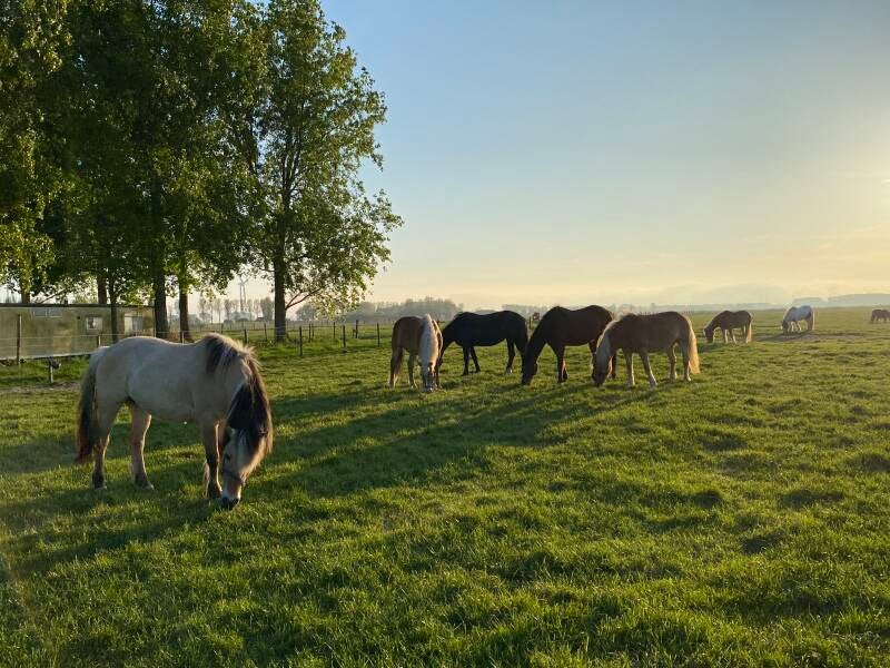In de lente- en zomermaanden zijn de paarden vrijwel altijd buiten. Zolang het weer het toelaat en de paarden het leuk vinden zijn ze 24/7 in de wei te vinden.